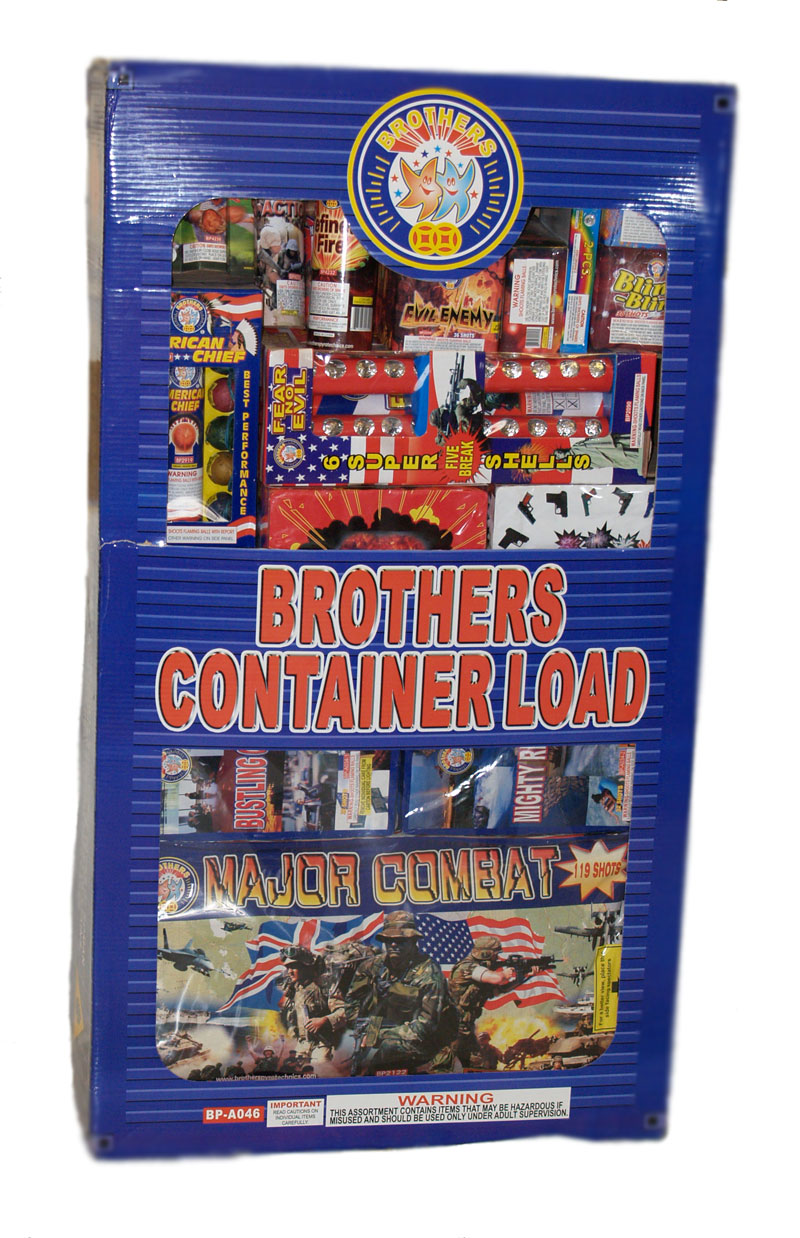 29 piece all product assortment with three artillery shell kits, three packs of roman candles, one pack of helicopters, one pack of ground spinners, ten fountains, one pack of firecrackers, five 200 gram cakes, and five 500 gram cakes.